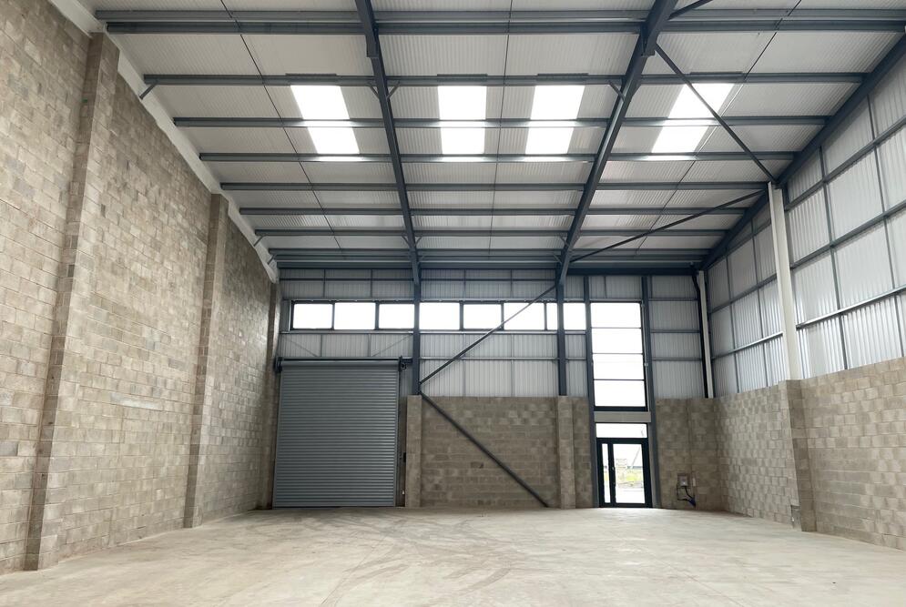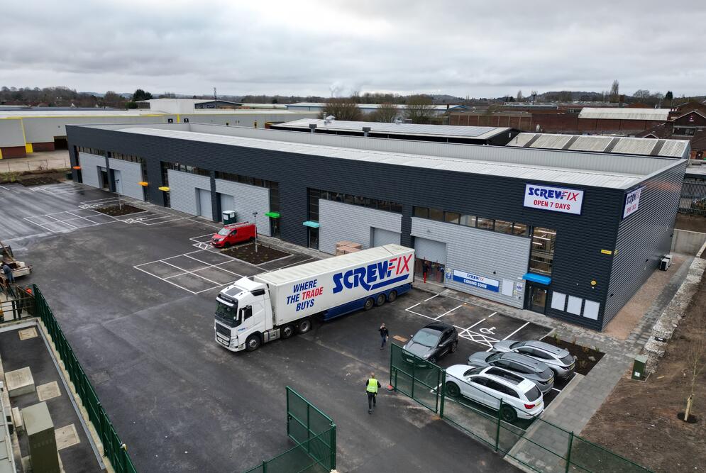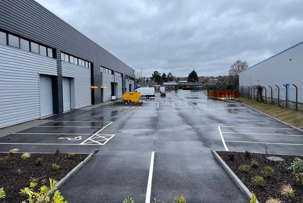 The units are arranged within a single terrace, each of a steel portal frame construction with blockwork elevations cloaked with full height profile cladding featuring enhanced glazing to boost nature light levels around a pedestrian access door.