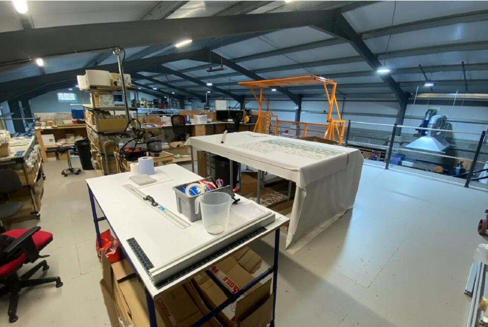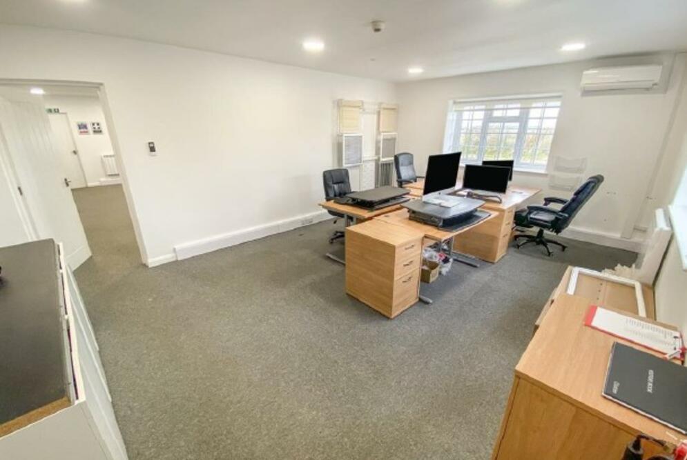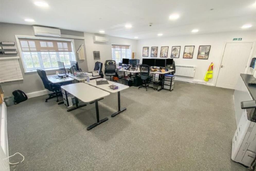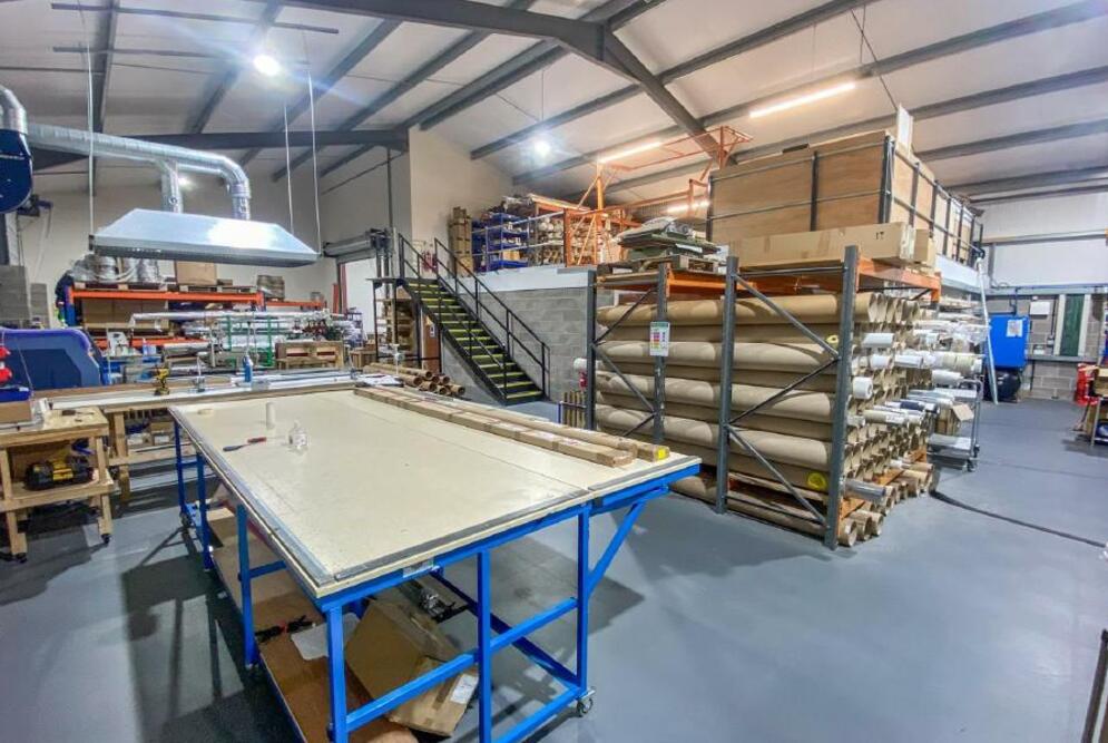 The unit is constructed with a steel frame and part blockwork/brick elevations beneath a pitched roof. The ground floor provides a spacious workshop/storage area along with offices, WCs, and a kitchen. Mezzanine floors have been added to create additional office and workshop space.